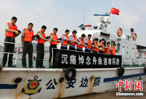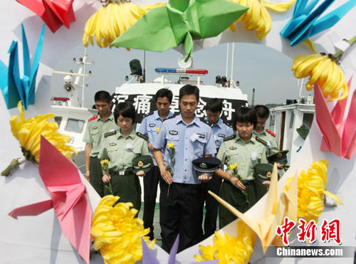 中新網舟山8月15日電(記者 趙曄嬌 通訊員 包能偉 呂賢斌)今天是紀念舟曲同胞遇難哀悼日,雖然相隔千里,但舟曲的災情依然牽動浙江人民的心。今天上午9點,在浙江的最東端——“海天佛國”舟山,正在公邊艇上執行巡邏任務的定海公安、邊防民警,舉行了簡短而莊嚴的哀悼儀式,他們將親手折疊的千紙鶴掛在艦艇上,手持黃色菊花默哀三分鐘。在海天交接處,民警將菊花灑向大海,愿逝者安息生者堅強。