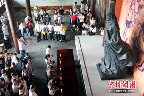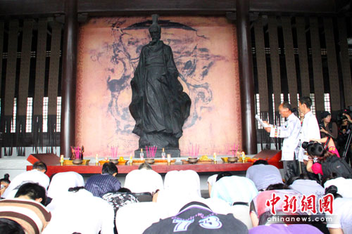 下午15時(shí)許,屈氏后裔登上位于鳳凰山頂?shù)拇蟮睿抢锇卜钪鴱臍w州鎮(zhèn)喬遷至此的屈原青銅像。屈氏后裔面對屈原像依次上香、獻(xiàn)祭,并行跪拜叩首大禮長達(dá)十?dāng)?shù)分鐘。