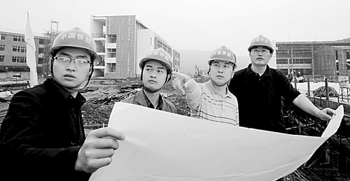 。學(xué)校建成后可容納5200名學(xué)生在校學(xué)習(xí)。今年9月1日,北川中學(xué)校園將正式交付使用。圖為施工現(xiàn)場(chǎng)的工程技術(shù)人員。