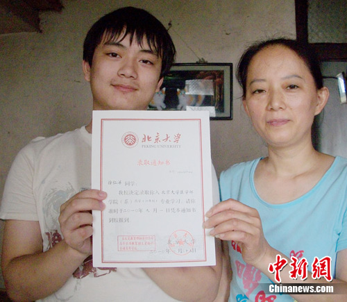 中新網(wǎng)重慶7月15日電 (連肖) 從徐仁洋接到北京大學(xué)的錄取通知書至今,母親楊治群已連續(xù)兩天晚上睡不著覺了。“我睡不著,一半是因?yàn)榕d奮,另一半則是惆悵。”楊治群說,他們一家三口 “蝸居”在重慶一個(gè)月租200元的出租房里,固定經(jīng)濟(jì)來源是每月260元的低保費(fèi),家中連兒子去北京的路費(fèi)都拿不出來,更別說高昂的學(xué)費(fèi)了。