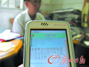 本報訊 (記者曾毅攝影報道) 今年74歲,曾任順德區(qū)人大代表的黃其廠老人,昨天終于等來了一條期盼多日的短信,“謝謝黃叔對我的鼓勵,我以后會改正我不足之處,以后多和父母溝通。”