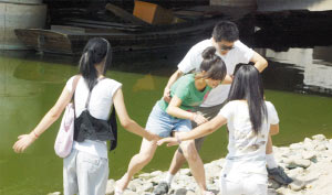 不少圍觀者接受采訪時表示,模擬“演戲”沒有必要非得“真刀實槍”。“其實他們這樣挺危險的,”一名中年婦女這樣說,“穿綠T恤的女孩都踩進水里了,要是她不小心摔倒,或者救她的人沒抱住她,搞不好她真的會落水。”
