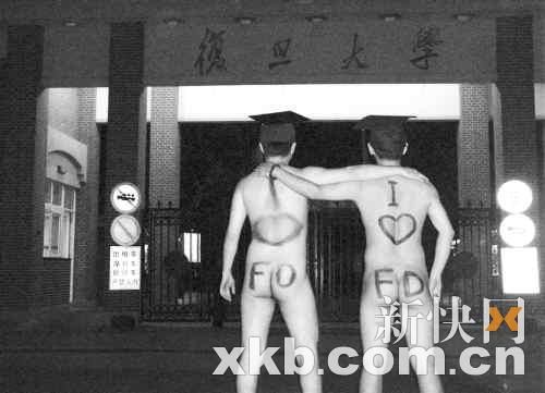 昨日,一條名為《復(fù)旦學(xué)生裸奔慶祝畢業(yè)》的圖文帖,火遍貓撲、天涯、華聲、網(wǎng)易等論壇。在貼出的圖片中,兩名男生頭戴學(xué)士帽,裸體在復(fù)旦校園內(nèi)奔走,并在學(xué)校大門、校訓(xùn)等多個(gè)地方留影。在網(wǎng)帖中,發(fā)帖者并未對(duì)兩名男生作介紹,但從其中一名男生在復(fù)旦的“恒隆物理樓”留影來(lái)看,網(wǎng)友們認(rèn)為這兩名男生應(yīng)該是復(fù)旦物理系的畢業(yè)生。