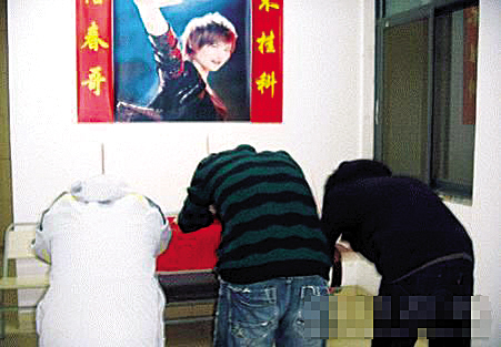 他與寢室同學商量,方案馬上得到全票通過。于是大家開始分工行動:去文星鎮買香爐、蠟燭與香,在學校商業街上的廣告公司訂制1×1.2米寬的李宇春海報。不久,寢室就被精心布置好了。上供品,燒高香,三鞠躬,儀式相當隆重。90后的小馬不無驕傲地向記者透露,這個點子絕對原創,全國僅此一家。