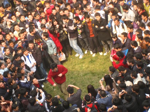 到今日中午,更有上千名“慕名”前來的校內外學生在女生所指定的樓下“圍觀”,等待著膽大的男生前來呼叫女主角,附近學校甚至有學生“組團”前往,并不斷有網友上網發帖報告事件進展。據網帖稱,稍后有一穿紅衣男子前來表白,將現場引向高潮。