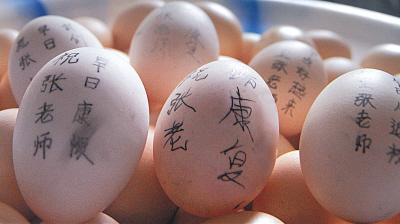 由于戴著口罩上課,張老師為讓學生們能夠聽清楚,經常一句話要重復兩三遍,一堂課下來常常累得口干舌燥。即使是這樣,張小林仍然一直堅持著。看著張老師戴著“面具”上課,初二一班的同學們悄悄湊了130個雞蛋,每個雞蛋上都寫著:“張老師,祝你早日康復!”“張老師,快點好吧”……學生余南瀾說,在班干部提議下,同學們每人拿兩個雞蛋送給張老師,一是祝福他,二是希望能為他補充營養。