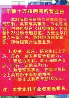 這條招聘啟事上商家自稱中央電視臺“科技博覽”曾經(jīng)作25分鐘專題報道。要招端莊,貌美,研究生以上學(xué)歷,具備—定英文會話能力,年薪10萬,謝絕大學(xué)本科學(xué)歷者報名。