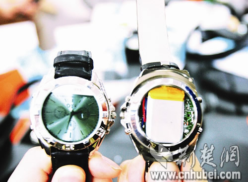 “竅門在這里。”工商人員把手表后蓋揭開,里面多了一塊微型電路板和芯片。原來,這是一套短信接收裝置,收到短信后,還可以存儲在手表中。