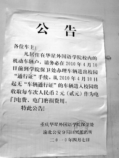 “我們住戶和學校完全是兩個獨立個體,學校根本沒有任何權力向我們收費。”家住華星外國語學院家屬樓1單元5樓的住戶龍兵生說,本月7日,學校保衛處在大門口通報欄處貼了一則收費公告,要求凡居住在校內有機動車輛的住戶務必在本月10號前到學院保衛處辦理進出“通行證”手續,否則將向進出校園的無“車輛通行證”的住戶,收取每人每車次2元,作為電門電費、電門磨損費用。