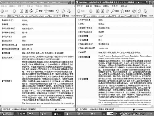 昨天(25日,下同)下午,記者按照這名網友提供的信息,登錄中國知網,分別下載了這兩篇碩士論文。