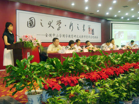 7月8日,全國中小學(xué)國學(xué)教育研究成都市青羊區(qū)現(xiàn)場會在蓉召開,來自北京、青島、重慶等地的上百名專家代表就國學(xué)教育在中小學(xué)校園內(nèi)的開展進(jìn)行了交流討論。據(jù)中國教育部語言文字應(yīng)用管理司司長王登峰透露,有關(guān)部門準(zhǔn)備邀請歌星演唱經(jīng)典詩詞,以契合中小學(xué)生的年齡特點(diǎn)和心理需求。