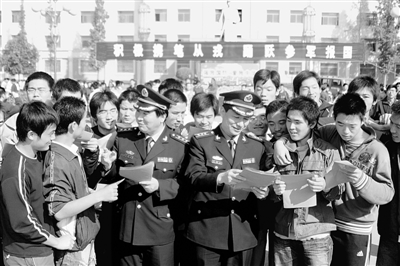 13萬大學生進軍營,是在一個特殊的背景下提出的。今年3月5日,十一屆全國人大二次會議上,國務院總理溫家寶在政府工作報告中明確提出,高校畢業生可“到農村基層服務和參軍入伍”。為鼓勵高校畢業生攜筆從戎,教育部、財政部、總參謀部等部門專門出臺了八項優惠政策。這些舉措,充分體現了國家對應屆大學畢業生的關懷。但是,軍隊敞開大門征召大學畢業生的意義和作用,不僅僅是為了單純地緩解社會就業壓力,更蘊含一個深刻的時代主題。