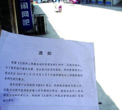 5月30日,有網友在天涯社區發帖稱,5月25日山西臨縣網吧協會貼出了網吧關閉的公告:“有關部門要求網吧停業,具體何時開放另行通知!痹摼W友稱據傳是因為即將到來的高考而強制關閉了該縣城所有網吧,“全縣所有的網吧都在劫難逃,光纜被停,只能用電話線上網!