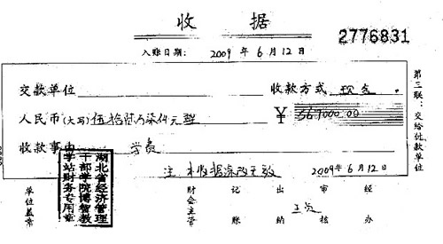 6月15日,學校籌集了45萬元現金,匯給了楊某的指定賬戶。令人意外的是,這個賬戶并不是學校的公共賬戶,而是一個名叫“王貞”的私人賬戶。等他們拿到收據后,上面蓋的公章是“湖北省經濟管理干部學院博智教學站”。