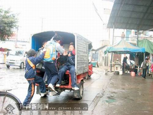 當天霧氣很重,還下著小雨,路面潮濕。在五一西路學校門口不遠的路上,一輛輛三輪摩托車雜亂的停在那里。一些看起來稍大的小學生一邊吃著手上的零食一邊往車上爬,上車之后從兜里掏出5毛錢遞給三輪摩托車手。記者發(fā)現(xiàn),那些三輪摩托車大多沒有牌照,一律的鋁皮車篷。有的已經(jīng)顯得比較破舊,連前輪的擋泥板都用鐵線綁住。而駕駛那些三輪摩托車的有男有女,有老有少,其中一輛三輪摩托車的車手看上去也就十五六歲。記者看到,其中一輛三輪車上了10多名小學生,還有一兩個要往上擠,但車上已經(jīng)沒有了空間,這兩個學生居然站在門口,雙手抓著車篷頂部,半個身體還露在外面。
