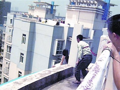 上午9時26分,青山公安分局工人村派出所接警后,值班民警迅速趕到現場發現,一位女孩站在12樓屋檐上欲跳樓,該所民警一邊組織小區保安疏散樓下圍觀者,一邊跑上房頂與女孩“談判”,穩定其情緒。消防官兵則在樓下鋪開救生氣墊。