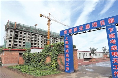 9月21日上午,記者驅(qū)車趕往太平村原址。在順義區(qū)北二環(huán)路南側(cè),記者看到,十余棟高樓已經(jīng)拔地而起,外部的墻體結(jié)構(gòu)均已經(jīng)建設(shè)完畢,但尚未粉刷。在工地的入口處,清晰地寫著“回遷房”等字樣。據(jù)工人們稱,工程是從年后開始的,曾經(jīng)在4月前后停了一段時(shí)間,后來又開始復(fù)工。