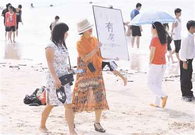 2月16日,農歷虎年正月初三,三亞市大東海海灘。一名“炒房”者打出廣告,轉賣花高價包下的酒店房間。春節前,她以每間房1500元的價格包下了某酒店初二到初五期間的10多間房,而平時這樣的房間標價在588元。讓這名“炒房”者沒想到的是,高價包來的客房卻賣不出去了,為了減少損失,她不得不在游人密集的地方打折賣房。旅游業內人士分析稱,三亞房價飆升有部分原因是旅行社和“黃牛黨”提前向酒店“買斷”一批高端酒店客房,然后待價而沽、大賺一筆。王凱 攝