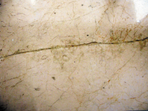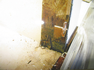近日,記者來到羅湖寶安南路幸福里樓盤,并隨當(dāng)事人李小姐前往她在小區(qū)3棟某戶的公寓。剛出電梯,一大堆裝修材料便映入眼簾,而房內(nèi)也是一片狼藉一片。在公寓內(nèi)部,堆放著一些拆卸下來的裝修材料及部件,客廳屋頂轉(zhuǎn)角處依稀有滲水的痕跡,衛(wèi)生間及廚房部分的門框都被拆掉。除此之外,當(dāng)事人還向記者指點(diǎn)了多處大理石的裂紋。