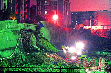 晚8點左右,記者趕到泉景天沅·秀園新建樓盤施工現(xiàn)場,這處工地南側(cè)緊挨著王女士居住的樓房。地基已經(jīng)挖到十幾米深,如刀切斧剁一般齊刷刷到底,橫截面上有一些用來加固土層防止坍塌的錨桿。根據(jù)記者目測,坍塌的地方長度約10米,土層從上到下一落到底(上圖)。為防止情況繼續(xù)惡化,施工方已經(jīng)采取了措施。兩輛渣土車正從挖出的土堆上往坍塌的地基處運送土方,而兩臺挖掘機則把運來的土方往坍塌處回填反壓。