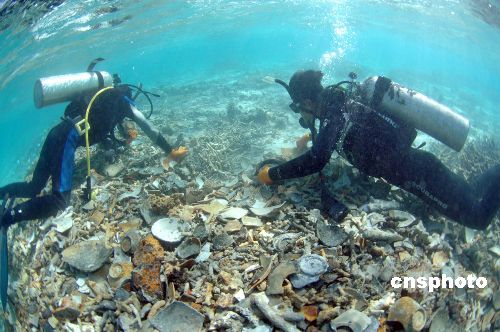 | 八日,中國遠(yuǎn)海考古第一艘沉船西沙華光Ⅰ號部分文物三百余件,首次在海口向媒體展示。據(jù)介紹,經(jīng)國家有關(guān)部門批準(zhǔn),今年三月十五日至五月八日歷時(shí)五十余天,由三十一位水下科考人員西沙考古工作隊(duì),在西沙群島對華光礁水下Ⅰ號沉船遺址和北礁沉船遺址,開展了搶救性發(fā)掘和水下考古調(diào)查工作,迄今共發(fā)掘并運(yùn)送上岸文物近萬件,是次水下考古已投資四百余萬元。華光礁屬中國海南省西沙群島范圍,位于永樂群島南部。華光礁Ⅰ號沉船遺址位于華光礁環(huán)礁內(nèi)側(cè),一九九六年由我國漁民發(fā)現(xiàn)。中新社發(fā) 西沙考古隊(duì) 攝