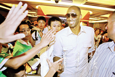 船艙里,穿著科比球衣的志愿者望眼欲穿。志愿者孫濤身上的科比8號球衣昭示著他鐵桿球迷的身份。“我喜歡他11年了!”還沒等記者發問,他便急不可耐地向記者介紹起自己身上地裝備。除了身上那件05版球衣,他還從包里小心翼翼地掏出一件連標簽還沒來得及撕掉的24號球衣,“24代表了超越喬丹的愿望,23+1嘛。”這個時候,眼里還是滿是即將見到偶像的興奮和激動。