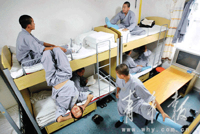 少林武僧團生活素描衣:青布長衣,青布長褲,手腳繃帶,黃布鞋。食素食,牛奶和豆制品是最富營養的“補品”。住求職公寓,十人間,上下鋪。行園區、宿舍,兩點一線。 (記者 張春雷)