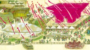 在中國館省區市館入口處,這幅長21米、寬0.47米的繪畫作品吸引了每一個經過的人。畫卷描繪了浦江兩岸世博園區內所有的場館以及近7000個游人,畫面上南浦、盧浦大橋橫跨兩岸,路上車輛、江面游輪、空中飛艇往來繁忙,園區內形形色色的建筑中間人流熙熙攘攘,一派熱鬧繁華的景象。有意思的是,長卷不僅展現了世博園區恢宏的場景,還刻畫了許多生動的細節,如畫中有兩個孩子在沖向他們喜歡的場館途中,男孩的帽子被風吹走了;一對情侶在深情擁吻;“小白菜”勸說躺在長椅上睡覺的參觀者等。