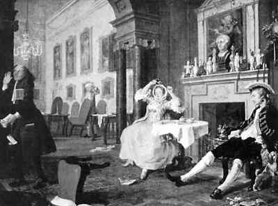 首先惹禍的是幾幅油畫作品。英國畫家威廉·霍加斯的著名作品《時髦的婚姻》在當時被展出,這組畫共有6幅:訂婚、時髦婚姻、求醫、音樂會、決斗、自殺。正是這一組帶有強烈批判意義的畫引發了上流社會的不滿和爭議,紅衣大主教更是大發雷霆,下令禁士教士、學校校長和家長前去參觀,這件事在當時也鬧得沸沸揚揚。