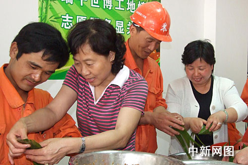 中新網上海5月28日電(舒祖康 鄭瑩瑩)“粽葉要平整,肉要放在米的中間,繩要扎緊……”端午時節,上海浦東世博社區——上鋼街道的居民來到上海世博會專用隧道建設工地,與建設者們一起包粽子 、過端午節。西藏南路越江隧道工地食堂里,十多名社區居民圍著桌子,一邊包、一邊指導著前來學包粽子的世博建設者們。食堂的一旁,上鋼社區文化中心藝術團的隊員們還為就餐的工人們獻上一段段精彩歌舞以表示慰問。完