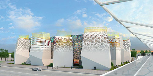 以“新俄羅斯:城市與人”為主題的俄羅斯館由12個塔樓和“懸浮在空中”的立方體組成,外形設計類似古代斯拉夫人的小村落,象征著生命之花、太陽以及世界樹(斯拉夫人枝葉繁茂的橡樹)的根。塔樓由白、金、紅三種顏色構成,白色和金色塑造了俄羅斯建筑的歷史形象,而紅色底色加上富有俄羅斯各民族元素的圖案,則賦予了塔樓頂部鏤空部分以生命力。