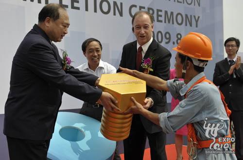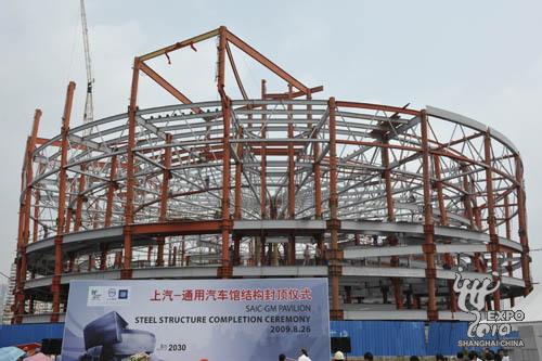 8月26日上午,2010年上海世博會上汽-通用汽車館鋼結構正式封頂,標志性的螺旋型建筑外觀雛形初現。上海世博局黨委副書記許偉國、上海汽車副總裁肖國普、通用汽車中國公司總裁兼總經理甘文維等出席封頂儀式,共同見證最后一顆螺釘釘入鋼梁。