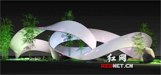(三)彰顯湖湘文化,突出湖南元素。展館的設計形象湖南色彩濃厚,竹、紙、芙蓉花、桃花源、武陵源概念等湖南元素以及蔡倫造紙、隆平水稻、白石藝術、毛澤東故事等湖湘人文形象貫穿整個設計。環體主體材料為竹結構,且整個場館掩映于竹林碧水之間,竹使人聯想起湘妃竹、瀟湘竹海和毛主席的詩句。整個魔比思環就像展開的卷軸,環體外表用紙裝飾,紙是中國古代四大發明之一,湘人蔡倫造紙,體現了湖南歷來有重視教育科技創新的傳統。芙蓉花代表湖南自然、綠色形象。還有懷素的草書、齊白石和黃永玉的畫,體現出湖南人對自然的膜拜、對美的執著追求。館名“桃花源里·Xanadu”更是顯現了桃花源的概念和世人對“世外桃源”的千年尋夢。并用這些濃厚的湖南元素設計組合,烘托出毛澤東詩句中的“萬類霜天競自由”、“桃花源里可耕田”、“芙蓉國里盡朝暉”的偉大浪漫主義情懷,把“都市桃花源”的理想境界推廣到全世界。