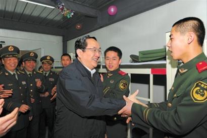 部隊(duì)駐地,戰(zhàn)士們精神抖擻,士氣高昂。俞正聲說,今天是大年初一,同志們辛苦了。按照黨中央、國務(wù)院和中央軍委的要求,大家遠(yuǎn)離家鄉(xiāng),在上海參加世博安保任務(wù),我代表上海市委、市政府和全市人民表示歡迎和衷心感謝。我們要按照胡錦濤主席在上海視察時的講話精神,確保世博會安保工作萬無一失,相信廣大武警和駐滬部隊(duì)?wèi)?zhàn)士一定能堅(jiān)決執(zhí)行命令,圓滿完成各項(xiàng)任務(wù)。戰(zhàn)士們鏗鏘回答:“絕不辜負(fù)黨中央、國務(wù)院、中央軍委和胡主席的重托,絕不辜負(fù)全國人民的殷切期待,堅(jiān)決完成上海世博安保任務(wù)。”