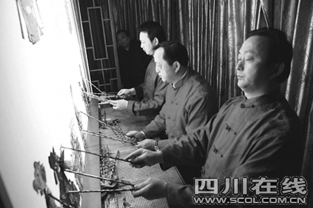 雪白的幕布上,兇猛的張飛,驍勇的關(guān)羽輪流揮刀騎馬上陣。鼓點(diǎn)越來(lái)越密,關(guān)羽與蔡陽(yáng)的搏斗也越來(lái)越激烈……昨日下午,閬中嘉陵江邊,王氏兄弟正在排練川北皮影戲經(jīng)典劇目《斬蔡陽(yáng)》,為參加上海世博會(huì)做準(zhǔn)備。