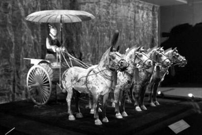 今天(1日)上午,上海世博會中國國家館的又一件鎮館之寶——“秦俑館一號銅車馬”在該館“國之瑰寶”展區亮相,這件國寶的展示將持續到世博會閉幕。