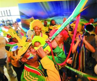 雖然開幕式要到20∶00才開始,但在19∶00不到的時候,南非館的門口和館內就已經喧鬧無比,受邀參加南非館世界杯開幕慶典的嘉賓,幾乎人手一個VUVUZELA,頭戴“馬卡若卡”(一種南非特色帽子,外觀像足球)。南非球迷的脖子上還掛著印有南非國旗的圍巾,臉上或手臂上也彩繪著南非國旗。