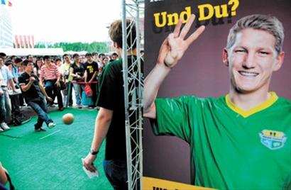 南非館前的籠式足球游戲成為園區最熱門的互動項目之一。雖然獎品只是世界杯紀念水壺,可球迷們都表示不是沖著獎品去的,幾小時內數百人在鐵籠中大秀腳法。期間,也有外國游客躍躍欲試。一名叫卡爾的德國男子看到足球就來勁,上前擺出的架勢頗為專業,最后還是三次全部踢偏。