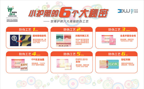 此外,記者了解到,改版后的世博護照還加強了防偽技術。據(jù)悉,改版《世博護照》各款產(chǎn)品封面的燙金世博Logo內(nèi)均采用了超線微縮密碼防偽技術,采用60倍的放大鏡觀看,則可清晰看到EXPO2010字樣。這一通常只用于鈔券的高端防偽技術被運用,標志著世博護照的防偽技術又上一個新臺階,同時也再次提升了世博護照的珍藏價值。