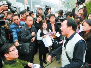 在昨天審理肖傳國(guó)一案的同時(shí),法院大門(mén)外也上演著一場(chǎng)“庭審”:接受肖氏術(shù)的患者和家屬以及肖傳國(guó)的支持者都自稱(chēng)自發(fā)來(lái)到法院,形成兩個(gè)鮮明陣營(yíng),將原本在網(wǎng)上互相發(fā)帖拍磚的論戰(zhàn)搬到了這里。
