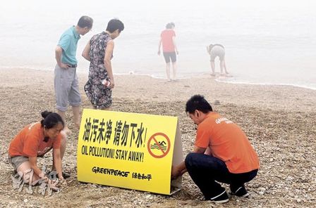 環保組織綠色和平昨日指出,受漏油意外污染的大連一帶海域,黑色油污已漸被清理,但海面仍漂浮油層。為保護游客安全,綠色和平在棒棰島等海濱浴場已豎立警示牌,提醒游人“油污未凈,請勿下水!”