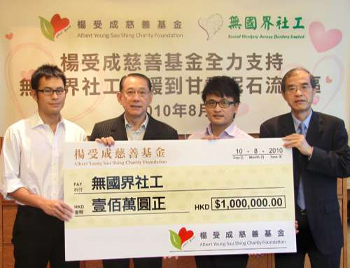 楊受成昨日以“楊受成慈善基金”名義,捐出一百萬港元予無國界社工。無國界社工將派出五名義工于本周五或以前到災區視察災情,并安排該一百萬元善款購買災民目前最需要的物資,例如一般生活必需品等。首批物資最快可于本月二十日送到災民手中。