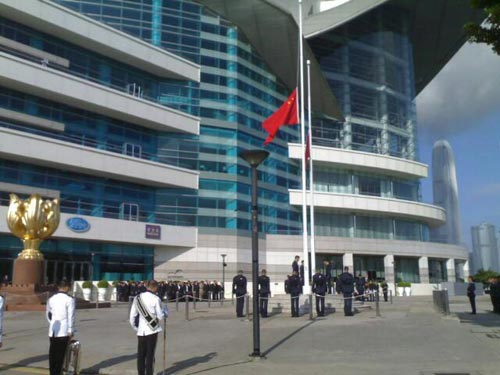 中新網8月26日電 綜合香港媒體報道,香港特區政府于灣仔金紫荊廣場舉行升旗及下半旗儀式,行政長官曾蔭權率領司局級官員,為馬尼拉脅持人質事件中的死難者,默哀三分鐘。出席人士都穿著黑色或素色衣服,神情肅穆。