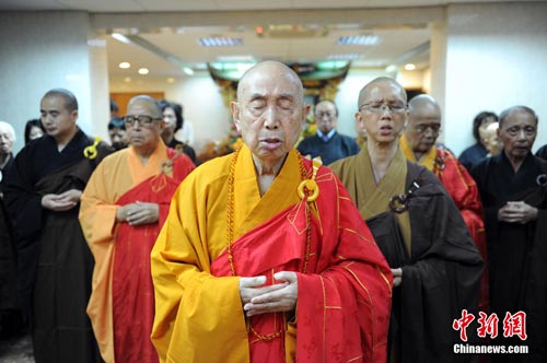 下午2時許,港島灣仔的香港佛教聯合會的會場,會長覺光長老主持拈香。他身后還有智慧法師、紹根法師、融靈法師等會內長老,都內穿黃色衣衫,外披紅色水田格袈裟。兩側恭敬站立著近30位佛教居士,著黑色海青和褐色袈裟。