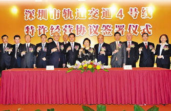 在18日的簽署儀式上,港鐵行政總裁周松崗與深圳市發(fā)展和改革局、交通局、國資委負(fù)責(zé)人先后簽署《深圳市軌道交通四號線特許經(jīng)營協(xié)議》、《深圳市軌道交通四號線建設(shè)標(biāo)準(zhǔn)及運營期滿后移交標(biāo)準(zhǔn)之協(xié)議》、《深圳市軌道交通四號線運營協(xié)議》、《深圳市軌道交通四號線一期設(shè)施租賃協(xié)議》共四份協(xié)議。