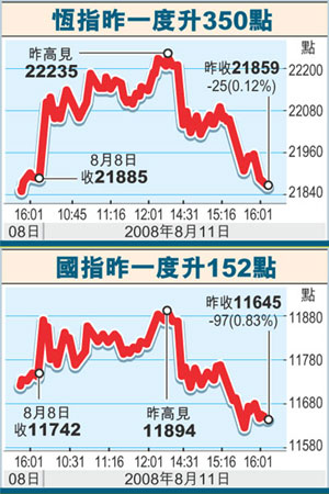 中新網8月12日電 據(jù)香港文匯報報道,受隔夜美股造好及內地股市大挫影響,港股11日先升后跌,大市開市高開135點,但午市受A股大跌逾5%影響,收市倒跌25.87點,收報21859.34點,成交總額僅575.90億元。市場人士指,市場關注內地的通脹數(shù)據(jù),港股后市料反復,恒指或下試21500點。
