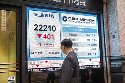 中新網11月27日電 據香港《文匯報》報道,市場擔心若迪拜世界一旦破產,會令多間主要借款銀行,包括匯控在內的歐洲大型銀行需要大額撇帳。亞太區股市普遍走弱,內地及港股也不能幸免,恒指26日曾跌500點,尾市跌幅略收窄,但也跌401點,收22210點,跌幅1.78%,成交773億元。