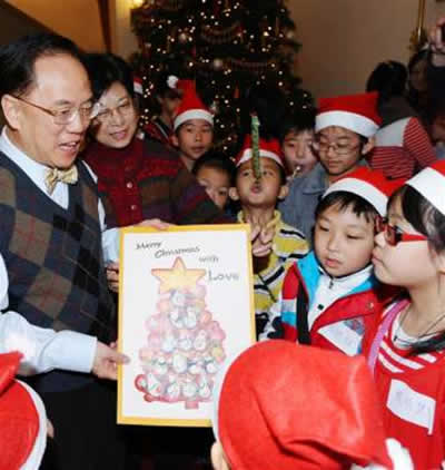 曾蔭權伉儷24日在禮賓府舉行了一個圣誕派對,邀請40多位來自深水埗的小學生,擔任他的特別嘉賓,一同歡度一個溫馨愉快的早上。曾蔭權在博客中透露,自己與小朋友在圣誕樹前大合照,他們又送其一張巨型的圣誕卡,里面全是他們可愛的簽名和祝福,其中一句“祝你長命一點”更是“搶眼”:“小孩的直率和可愛,令我不禁失笑!