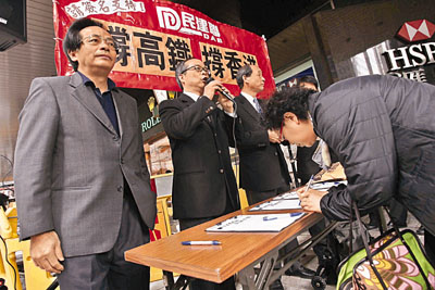 自由黨14日中午12時開始,也在中環(huán)發(fā)起“80后撐高鐵、反拉布”活動,呼吁市民簽名“撐高鐵”,短短2小時收集近2000個簽名,并交給立法會財委會主席劉慧卿,同時將一封請愿信交給行政長官曾蔭權。