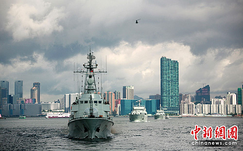 與此同時,駐港部隊航空兵團的直升機編隊也準時從石崗機場起飛,開始執行空中巡邏任務,在對香港重要街區情況、重點目標進行空中偵察和監視后,空中直升機編隊于8時50分飛抵維多利亞港上空,并與海上巡邏的5艘艦艇混合編隊,一起執行聯合巡邏任務。